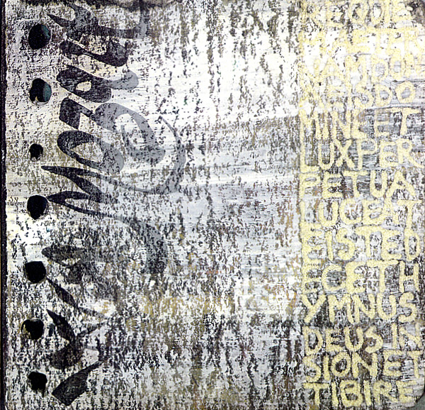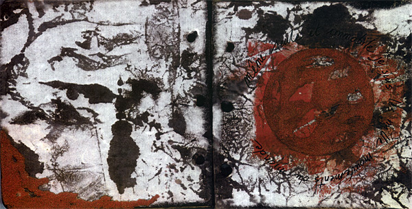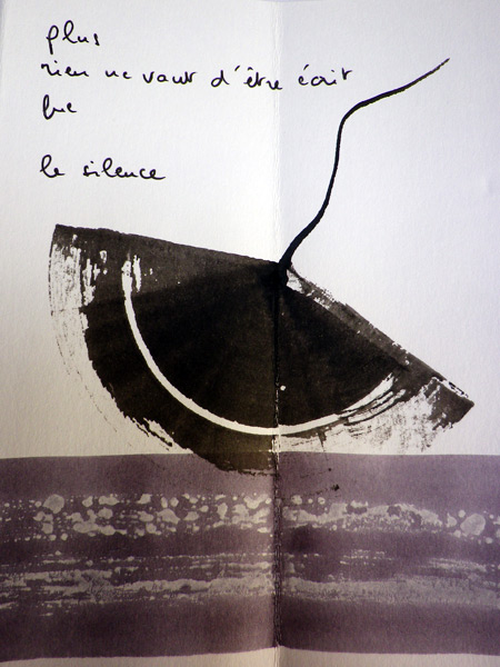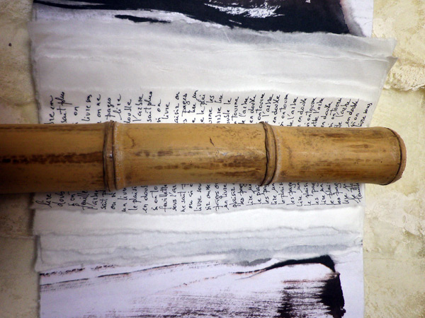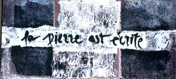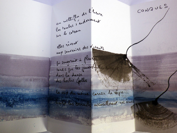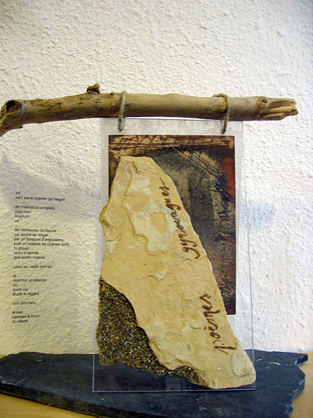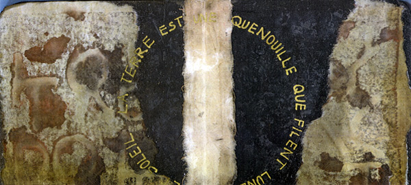 L’écriture est spéculaire, les mots à peine lisibles. Les poèmes en filigrane ou cachés à l’envers de l’oeuvre ne livrent leur message qu’à travers une savante mise en scène.