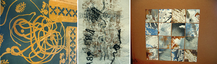 Enduits cires, sables grattés, toiles enduites rouillées, collages, réserves, batik sur papier, les pigments et liants